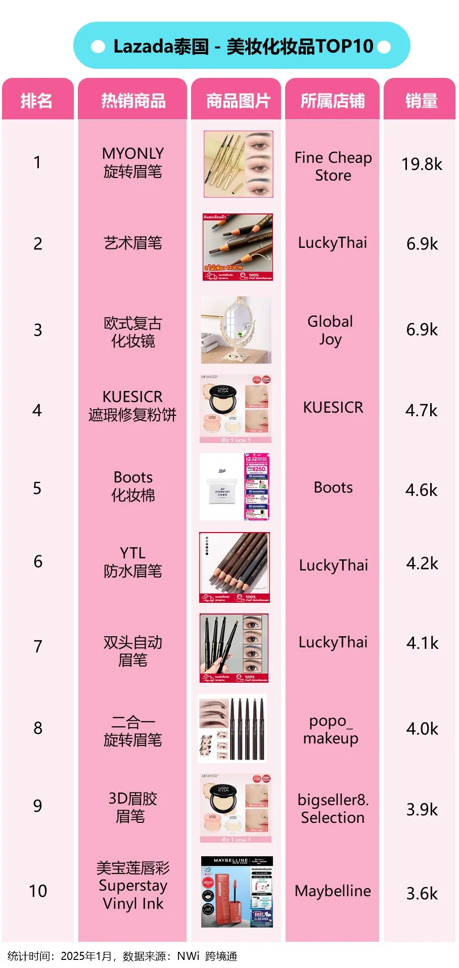 泰国消费者在Lazada平台上尤为青睐眉笔。1月数据显示,功能性旋转眉笔、二合一眉笔、防水眉笔及3D眉胶眉笔等产品深受消费者喜爱,占据化妆品榜单TOP10中的6个席位。此外,化妆镜、化妆棉等化妆品配件也榜上有名。美宝莲Superstay唇彩成为唯一上榜的彩妆品牌,显示出其在泰国市场的强大影响力。