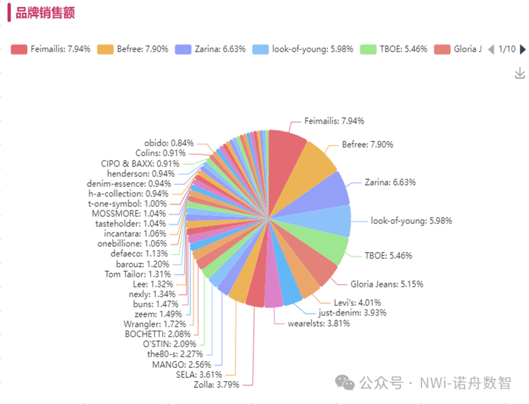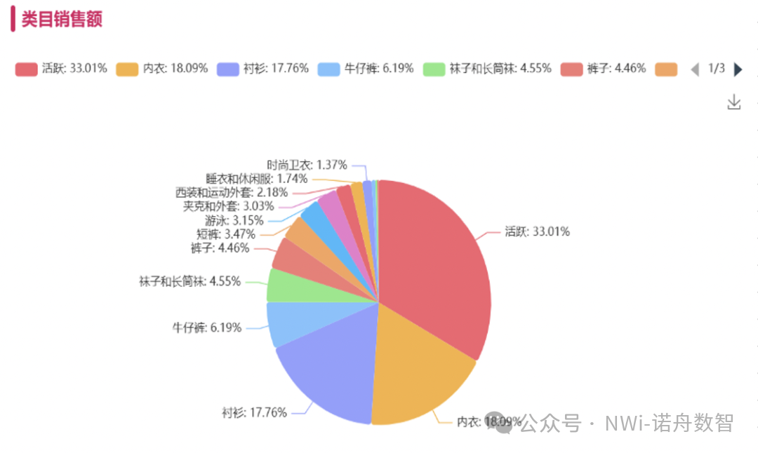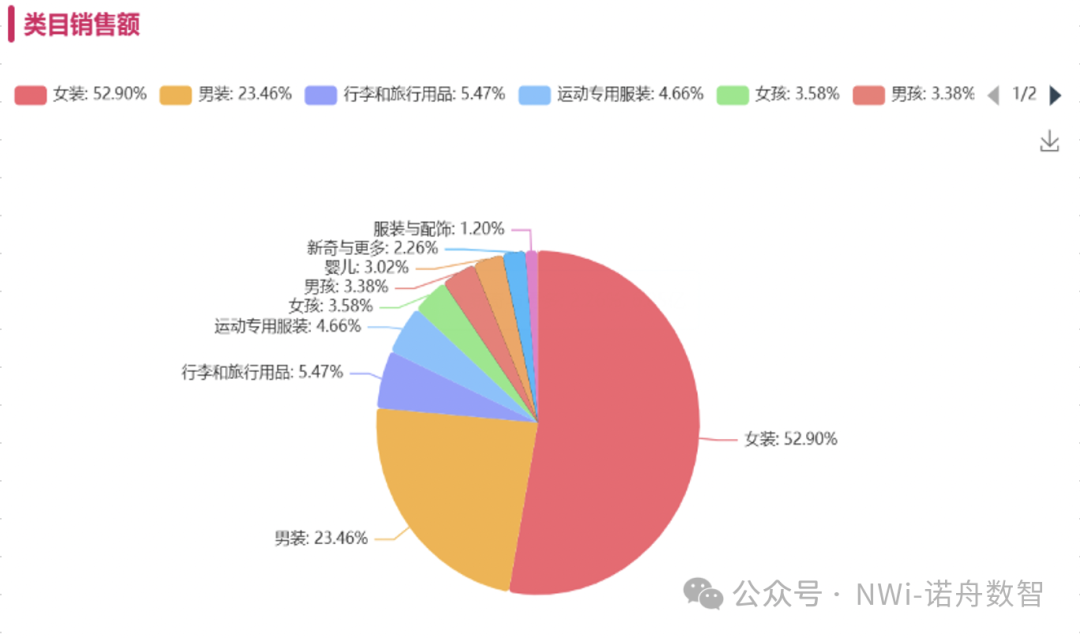 平台服装类销售数据,男装和女装的销售额占比最大,其中女装占比