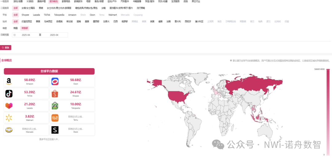 NWi诺舟数智自2023年起开拓海外数据服务,目前覆盖多个主流海外电商,可观测Amazon、Lazada、Shopee、Tik tok等海外平台全类目市场销售表现,覆盖欧、美、东南亚等近30个国家站点,帮助品牌深度洞察海内外市场差异,挖掘海外各国市场机会,布局海外市场