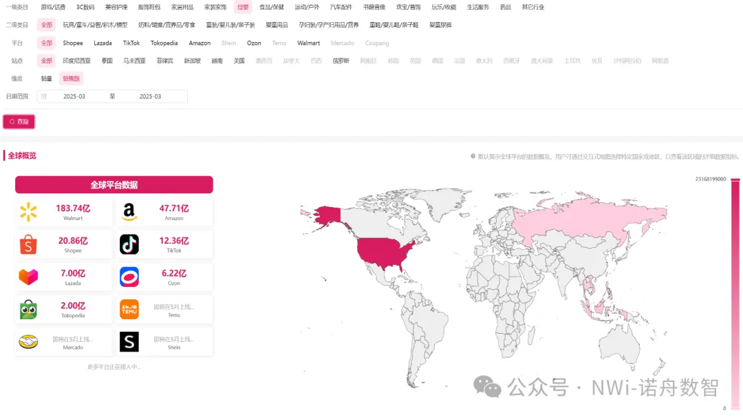 NWi诺舟数智自2023年起开拓海外数据服务,目前覆盖多个主流海外电商,可观测Amazon、Lazada、Shopee、Tik tok等海外平台全类目市场销售表现,覆盖欧、美、东南亚等近30个国家站点,帮助品牌深度洞察海内外市场差异,挖掘海外各国市场机会,布局海外市场