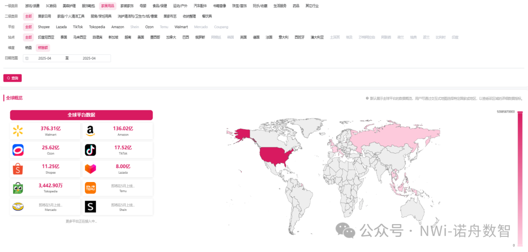 NWi诺舟数智自2023年起开拓海外数据服务,目前覆盖多个主流海外电商,可观测Amazon、Lazada、Shopee、Tik tok等海外平台全类目市场销售表现,覆盖欧、美、东南亚等近30个国家站点,帮助品牌深度洞察海内外市场差异,挖掘海外各国市场机会,布局海外市场