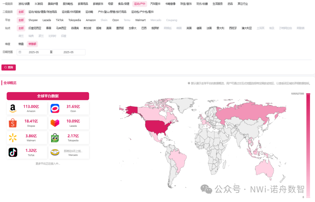 NWi诺舟数智自2023年起开拓海外数据服务,目前覆盖多个主流海外电商,可观测Amazon、Lazada、Shopee、Tik tok等海外平台全类目市场销售表现,覆盖欧、美、东南亚等近30个国家站点,帮助品牌深度洞察海内外市场差异,挖掘海外各国市场机会,布局海外市场