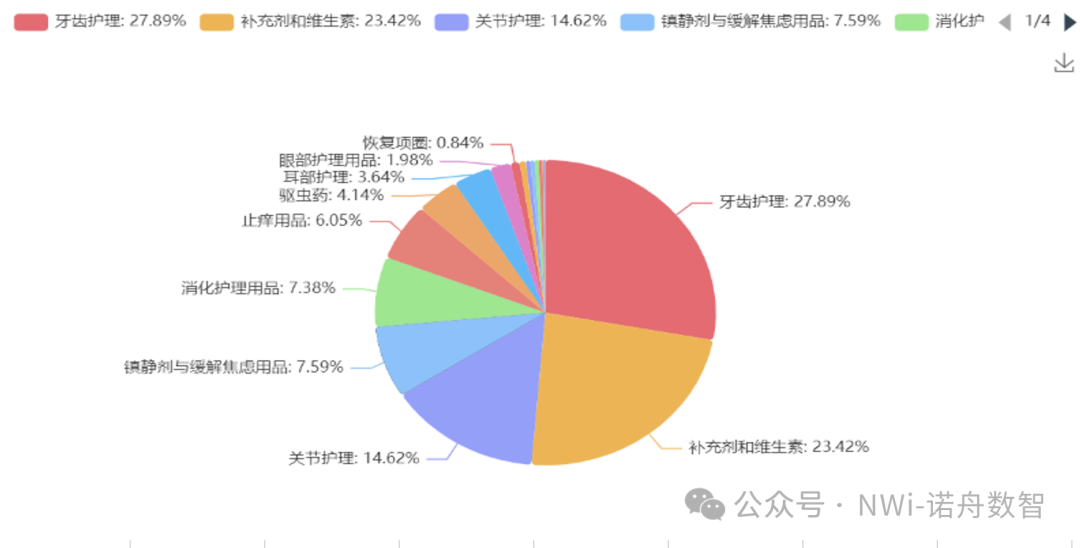 Dental care accounts for 27.89%, supplements and vitamins account for 23.42%, and joint care accounts for 14.62%.